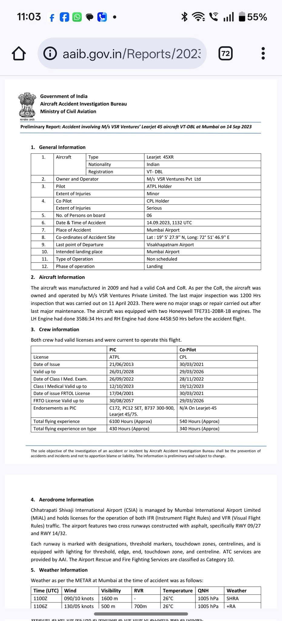 हा अहवाल नागरी विमान वाहतूक मंत्रालय, भारत सरकार यांच्या एअरक्राफ्ट एक्सिडेंट इन्व्हेस्टिगेशन ब्युरोचा आहे.