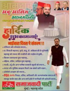 समाजवादी नेते आणि मुंबई/ महाराष्ट्र प्रदेश के अध्यक्ष मा. आमदार अबू आसिम आजमीजी का जन्मदिन ८ अगस्त मुंबई और पुरे महाराष्ट्र मे भाईचारा दिन के रूप मे मनाया जाता है. राज्य के दबे कुचले समाज, पिछाडे, दलित, महिला और अल्पसंख्यांक समाज के न्याय, हक्क और अधिकार की लढाई आजमीसाहेब पिछले ४ दशक से लढ रहे है. जो शक्तींया नफरत की राजनिती करके भारतीय समाज को धर्म और जातीयों मे बांट ने का काम कर रही। इन शक्तीयोंके खिलाप आजमी साहेब सडक से संसद तक संघर्ष कर रहे है. समाजवादी विचारधारा के मसिहा डॉ. राम मनोहर लोहिया और धरतीपुत्र नेताजी मुलायमसिंहजी यादव के विचार और आदर्श की राजनीति को उन्होंने अपना पुरा जीवन समर्पित किया है. इस समर्पित व्यक्तित्व को आज जन्मदिन की मुबारकबाद, सलाम और क्रांतिकारी जयभीम….!