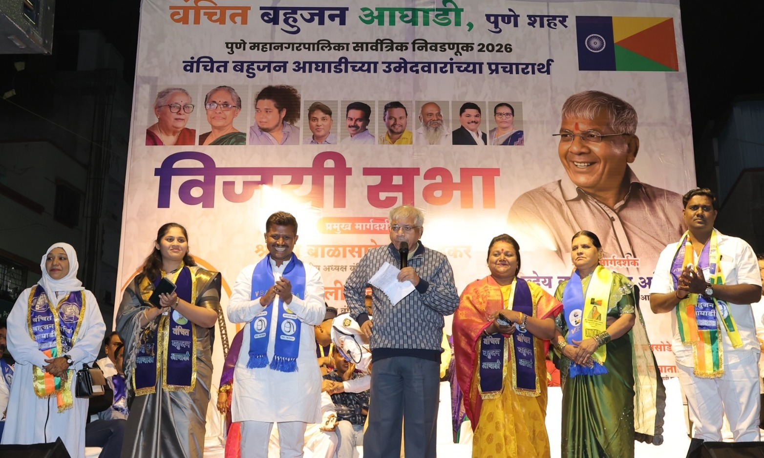 पुणे महानगरपालिका निवडणूक प्रचाराची रणधुमाळी शिगेला पोहोचली असून, वंचित बहुजन आघाडीच्या प्रभाग ६ आणि प्रभाग १३ मधील उमेदवारांच्या प्रचारार्थ ॲड. प्रकाश आंबेडकर यांची येरवडा येथील लक्ष्मीनगर भागात जाहीर सभा झाली. प्रभाग क्रमांक १३ मधील डॉ. निकिता गायकवाड, रामिजा रज्जाक नरसणगी, स्वाती सुरेश धनगर, अॅड. गजानन श्रीराम चौधरी, तसेच प्रभाग क्रमांक ६ मधील शैलेश ऊर्फ पाला मोरे, सलमा सादिक शेख उपस्थित होते.