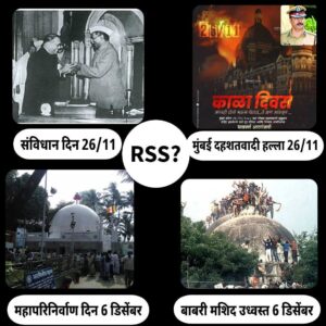 संविधानाचे शिल्पकार, निर्माते डॉ. बाबासाहेब आंबेडकर यांच्या ६ डिसेंबर ये महापरिनिर्वाण दिनी आपण बाबरी मशीद शहीद केली. हा हल्ला एका मशिदीवरील नव्हता व नाहीतर तर तो संविधानाच्या शिल्पकारावरील हल्ला होता व आहे. त्याशिवाय २६ / ११ हा दिवस संविधान दिन म्हणून साजरा करण्यात येतो. याच दिवशी मुंबईत अतिरेकी हल्ला होतो. व त्यानंतर हा दिवस काळा दिवस म्हणून साजरा करण्यात येवू लागला आहे. तुमची ही नीच कृत्य समजून येत आहेत. पण लक्षात ठेवा या देशातील प्रत्येक माणूस अशोक चक्रांकित तिरंगा ध्वज, संविधान व लोकशाही राज्य व्यवस्थेवर निष्ठा ठेवून आहे. त्यामुळे अंतिमतः तुमचा पराभव अटल आहे. हा तुम्ही डेमेज करू शकता. जे आज करीत आहात. डॉ. आंबेडकर, त्यांच्या संविधान व लोकशाही विरोधी लढणे म्हणजे शंभर टक्के हार. मग हरणारी लढाई का लढता. याचा विचार संविधान दिनानिमित्त करा.